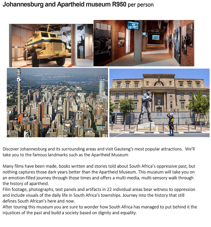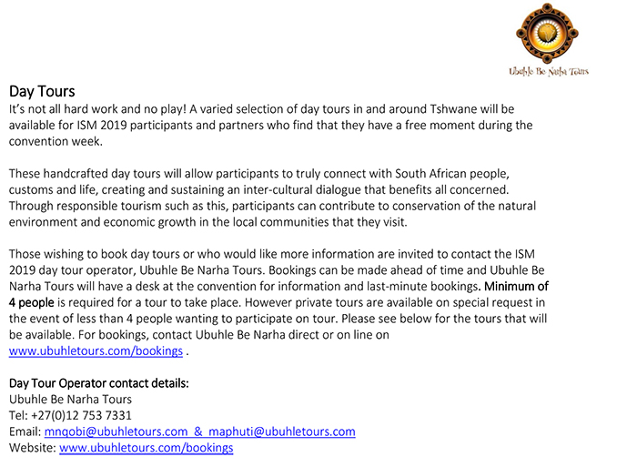 Day Tours: Not included in registration feeSecure bookings directly with Ubuhle Be Narha TourOrganized in partnership with Ubuhle Be Narha TourWeb:www.ubuhletours.com/bookings/